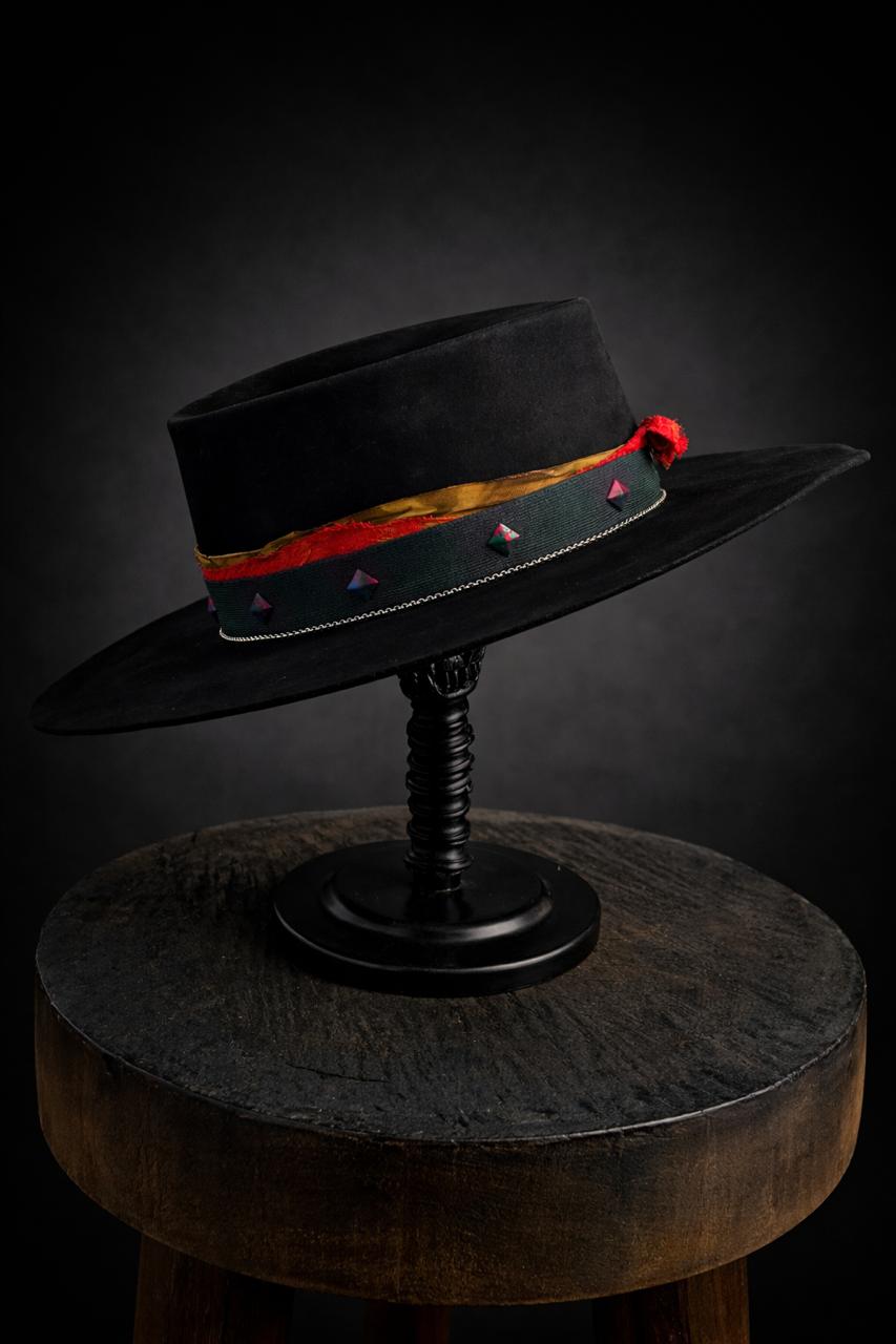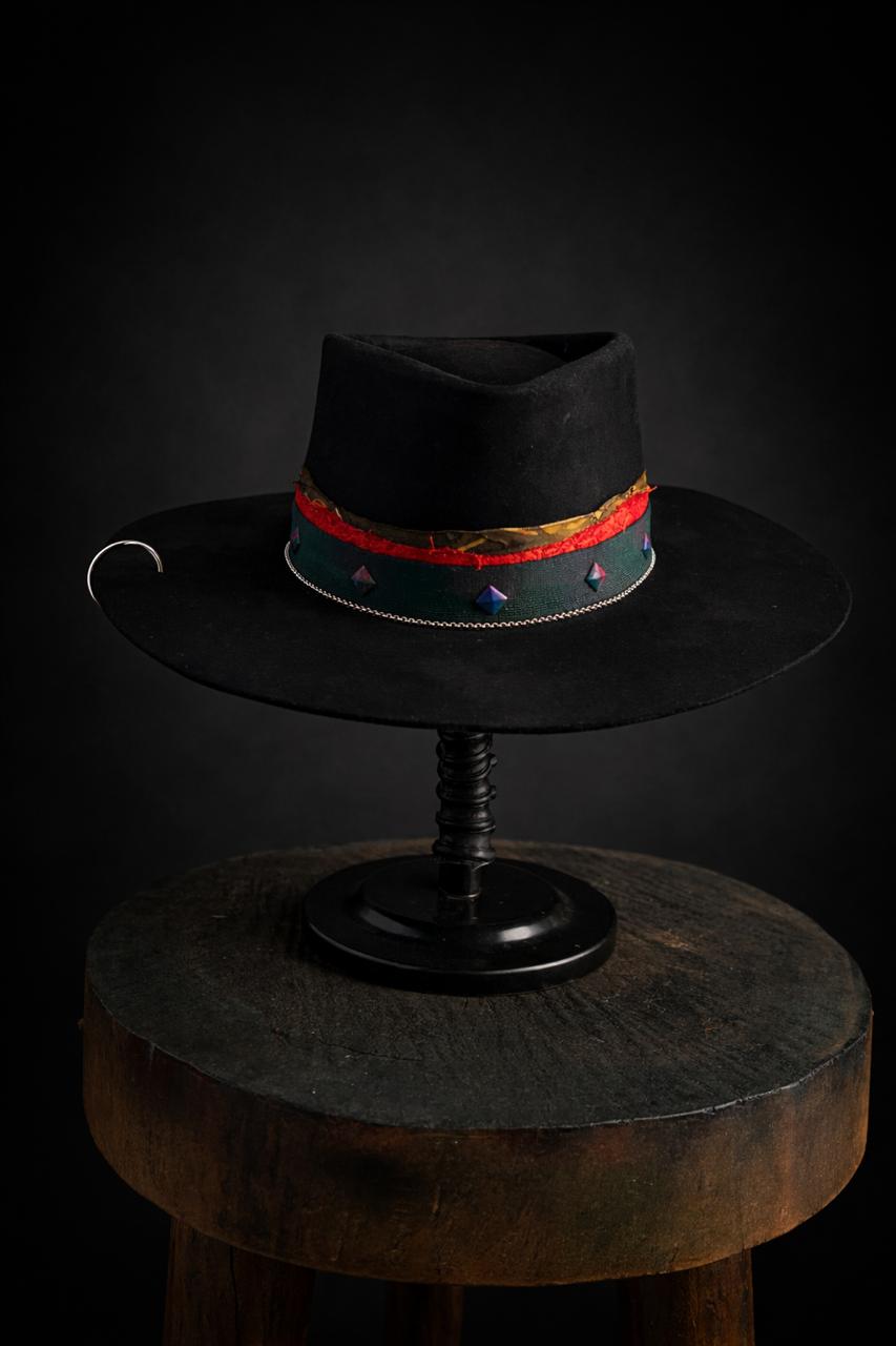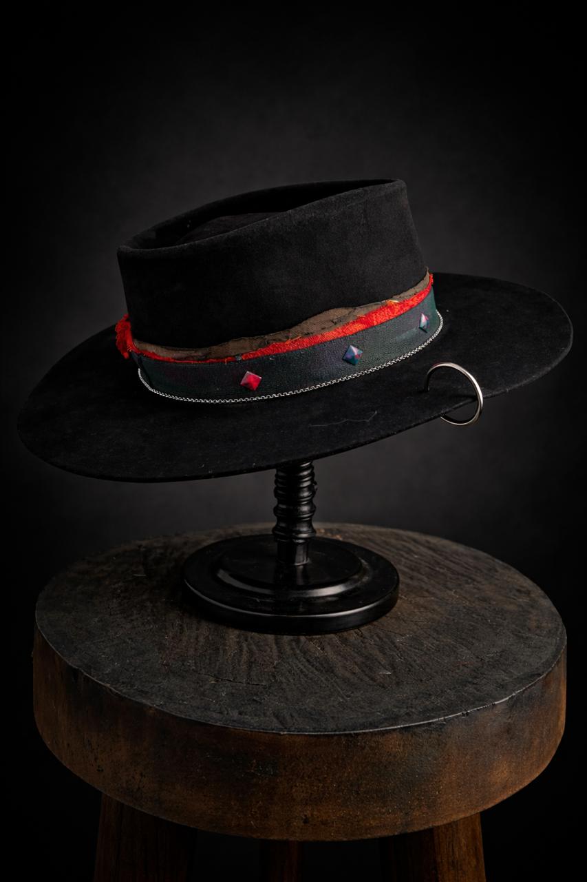 A bold study in contrast and hardware. This hat utilizes clean, architectural lines to create a silhouette that is both imposing and refined. The tri-tone band—fusing raw-edge red velvet with a structured forest-green ribbon—is anchored by a delicate silver chain that drapes across the brim. With its unique brim-piercing and geometric studwork, it’s a high-fashion take on gothic rebellion.