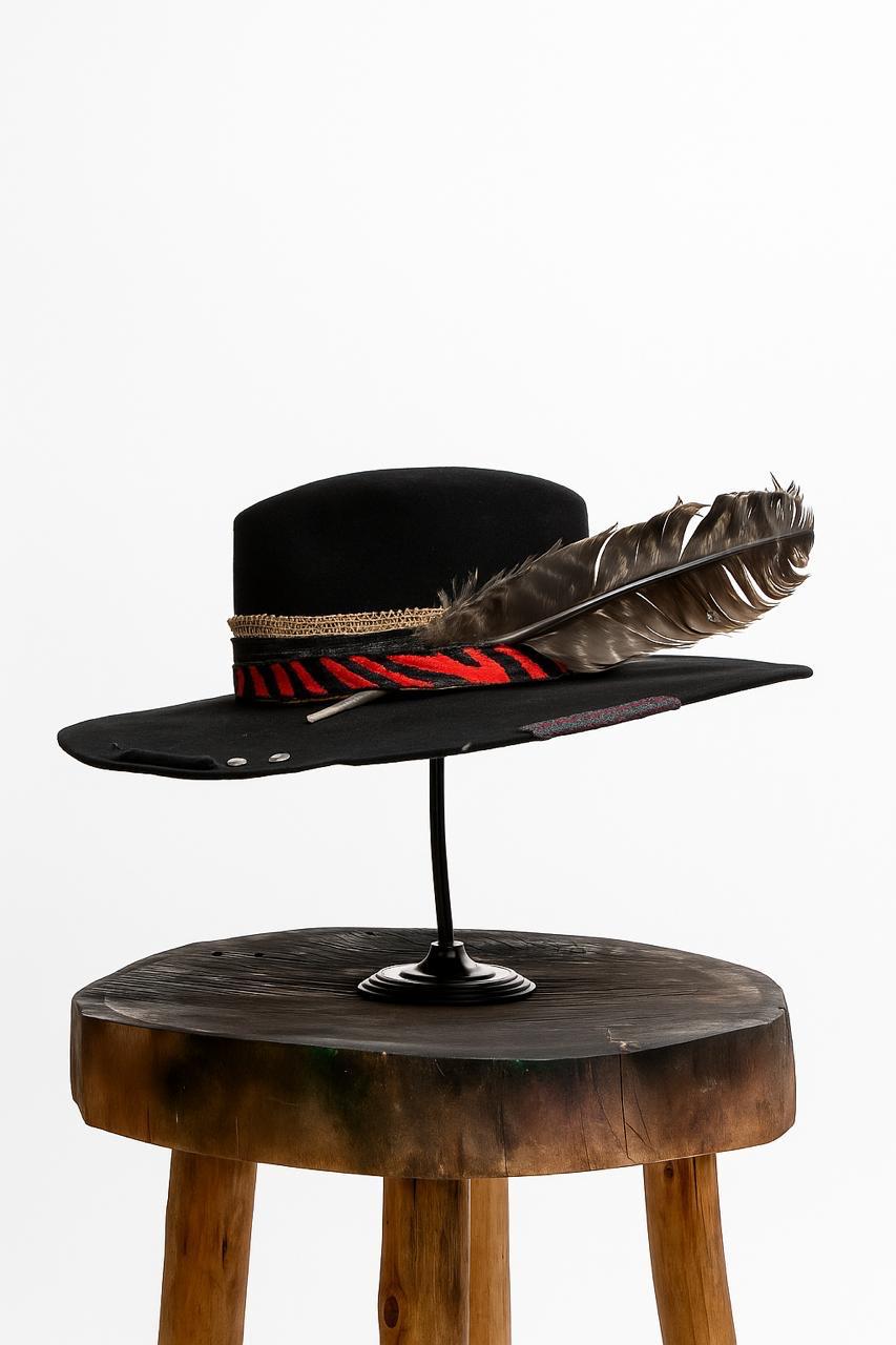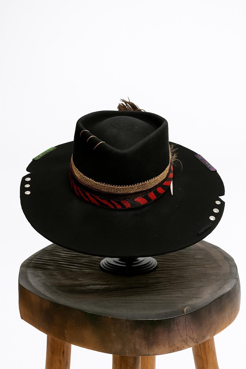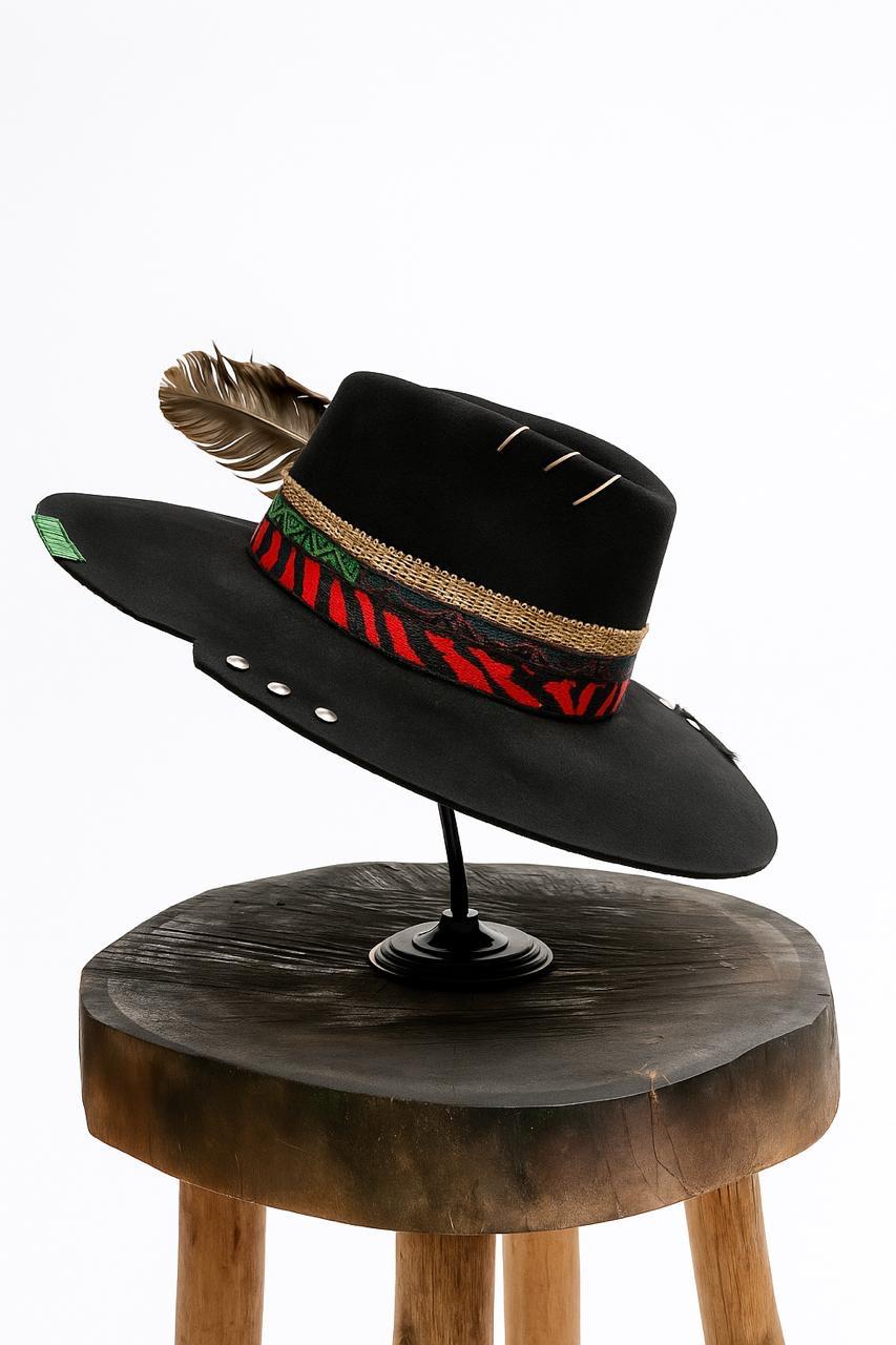 Bold textures meet a minimalist silhouette. This wide-brimmed statement piece breaks the rules with a unique distressed brim featuring metallic grommets and a textured patch. The contrast between the sleek black felt and the vibrant red animal-print wrap creates a visual heartbeat, while the oversized feather adds an organic, free-spirited touch to a structured design.