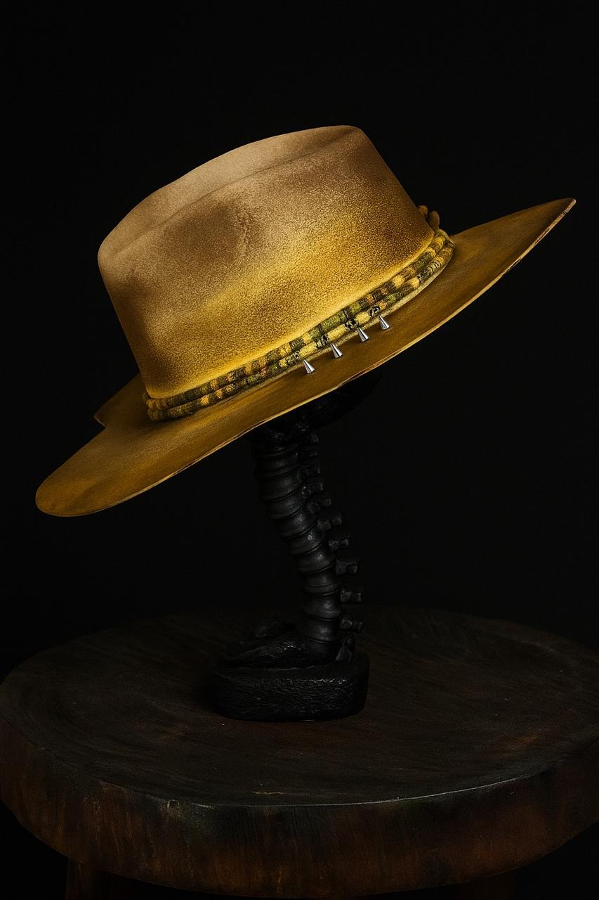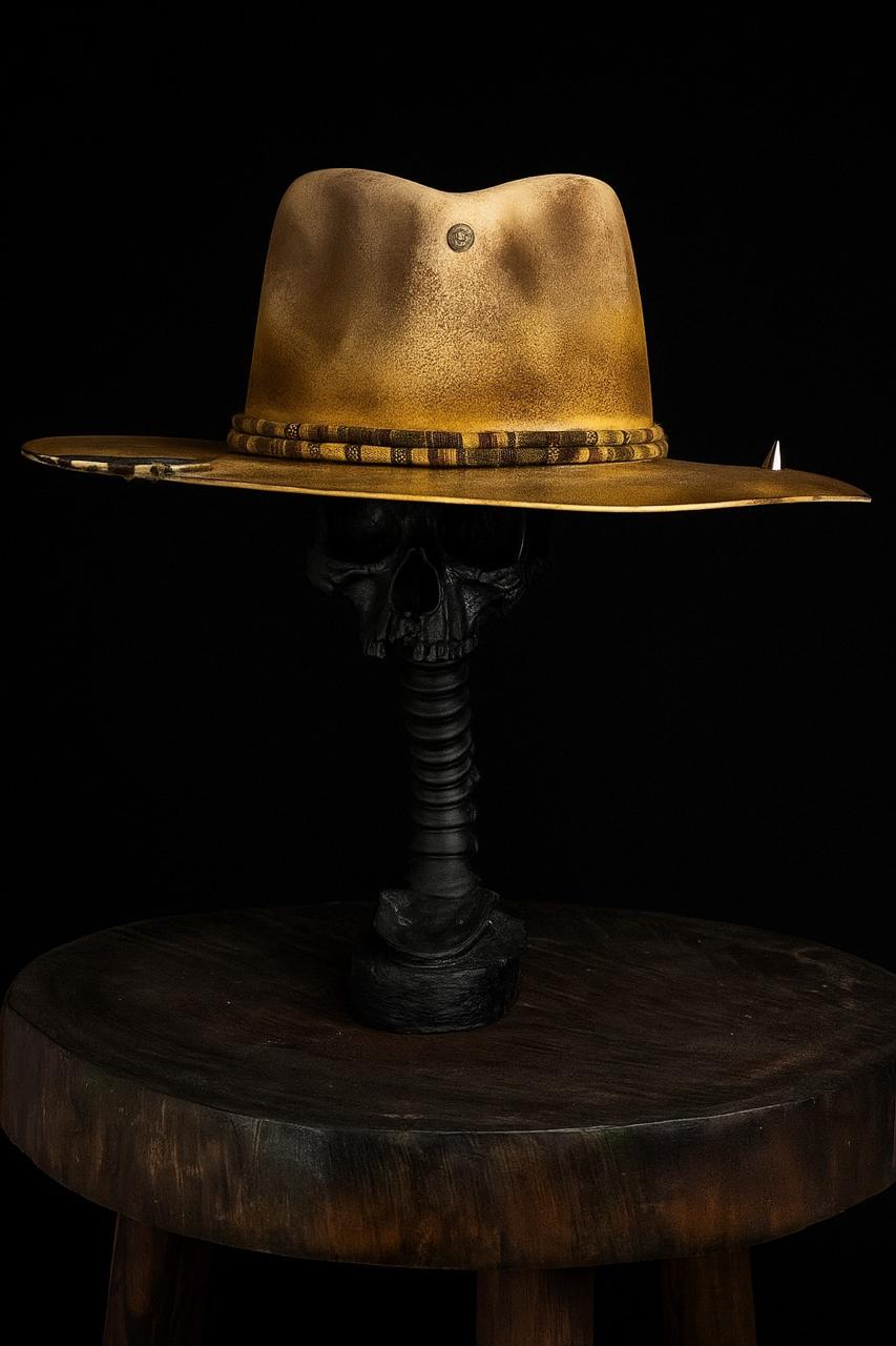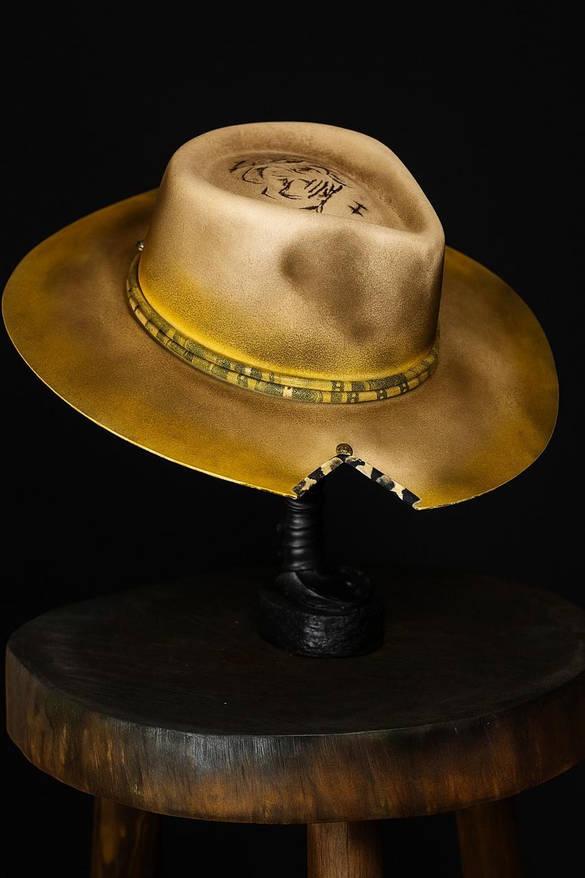 A crown forged in the spirit of the desert sun. This stunning piece features a unique amber-to-gold gradient fade across premium felt, giving it a permanent “golden hour” glow. The crown is etched with an intricate tiger motif, symbolizing power and untamed spirit, while the brim features a dramatic geometric “bite” cutout lined with a matching patterned underlay. It is a bold, high-contrast statement for those who lead rather than follow.