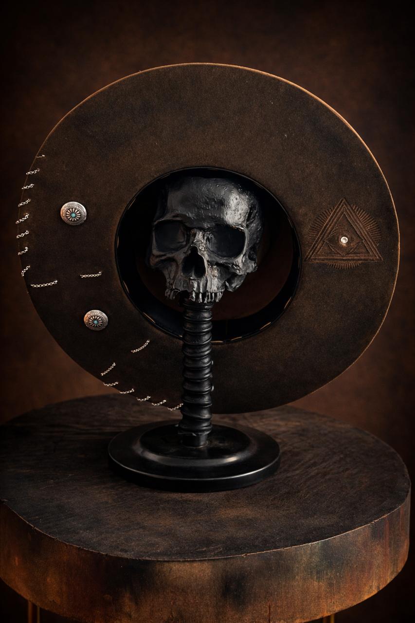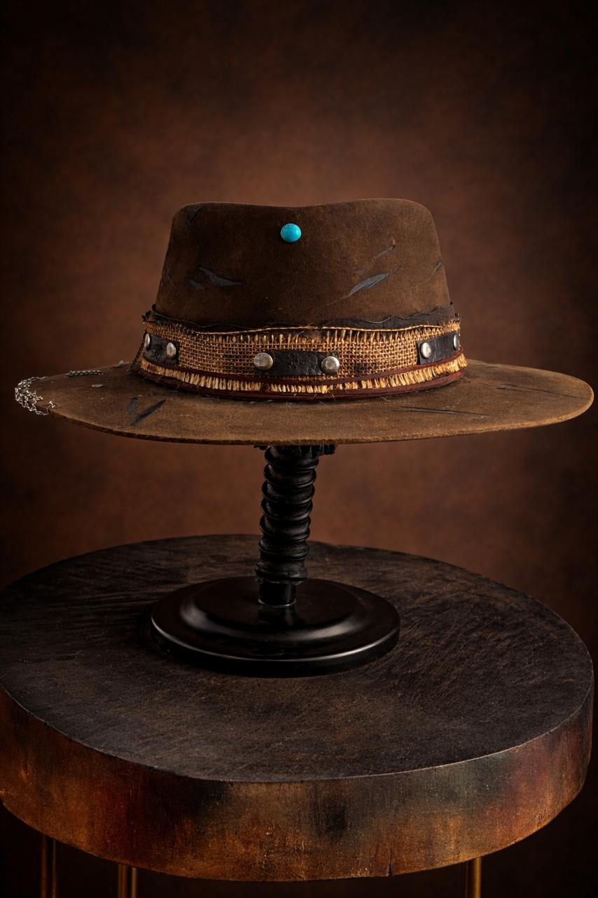 A piece with a thousand stories etched into its surface. This tobacco-brown felt hat is a masterclass in intentional weathering, featuring hand-carved “scar” marks across the crown and a brim edge stitched together with industrial silver chains. The band is a rough-hewn mix of natural burlap and studded leather, creating a texture that feels unearthed rather than manufactured. It’s the ultimate crown for the rogue traveler.