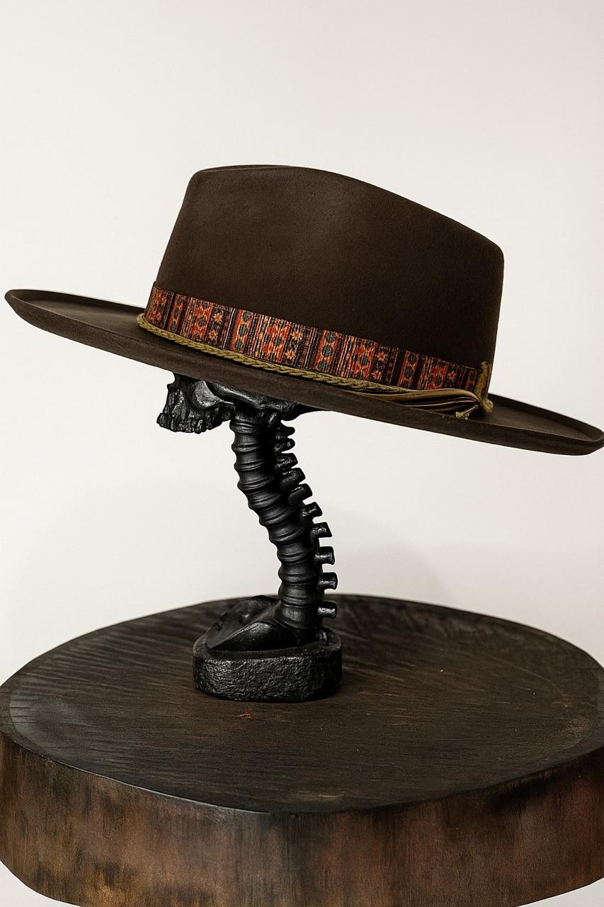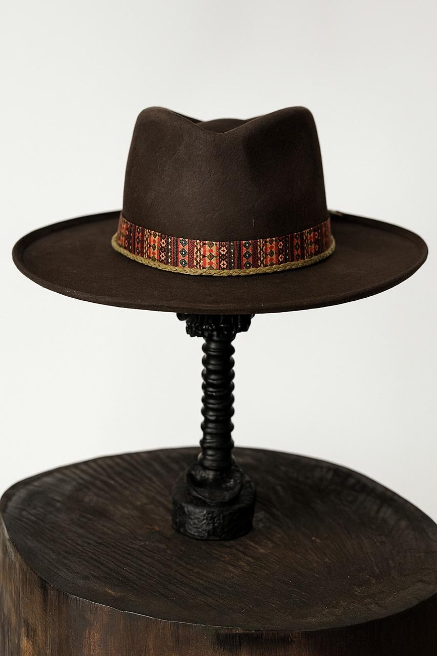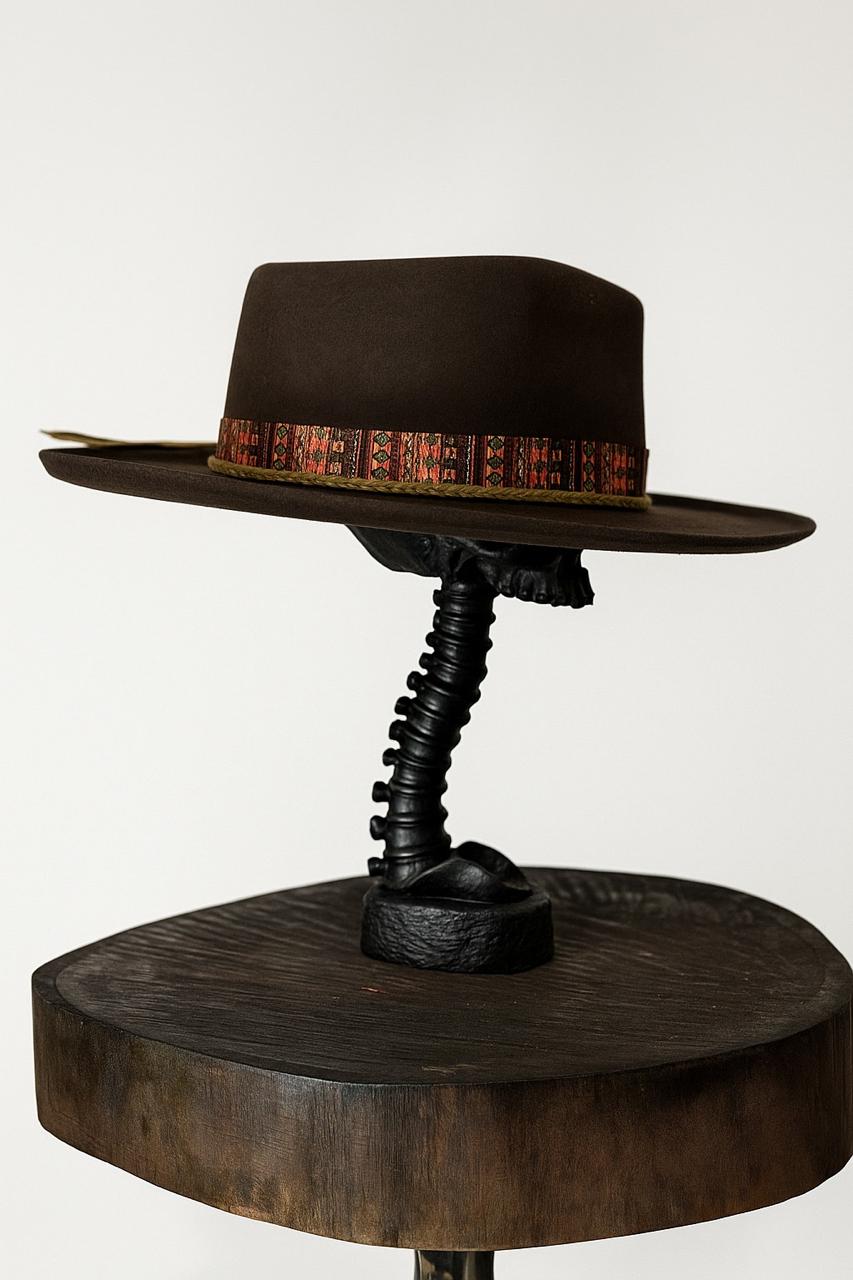 A soulful addition to any collection, this hat blends structure with story. The dark, velvet-smooth felt provides a moody canvas for the vibrant, ethnic-inspired woven band. Its clean lines and architectural brim make it a versatile statement piece, perfect for transitioning from gallery openings to sunset drives. A subtle, high-quality finish for the discerning collector.